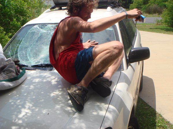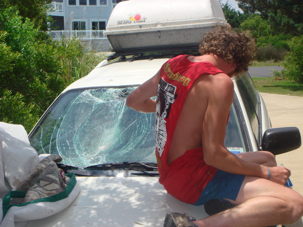 WILL FELL ON ANDYS WINDSHIELD FROM THE THIRD FLOOR